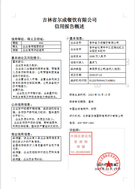 二、本信用證書和信用檔案是中立和中性的,它證明該單位已納入社會(huì)信用體系的監(jiān)督之中,任何組織和個(gè)人可以遵循誠信原則方便地對(duì)該單位進(jìn)行評(píng)價(jià)(表?xiàng)?、批評(píng)、建議);任何組織和個(gè)人可以方便地查詢?cè)搯挝涣己眯畔?、不良信息和整改信息。該單位也可以通過誠信經(jīng)營不斷增加信用分值和增加良好信用信息記錄,積累信用無形資產(chǎn)。三、根據(jù)該單位提供的相關(guān)資料,依據(jù)中華人民共和國信用行業(yè)標(biāo)準(zhǔn)Q/ZYX 002-2019《企業(yè)信用評(píng)價(jià)體系標(biāo)準(zhǔn)》,專業(yè)第三方信用評(píng)價(jià)機(jī)構(gòu)或信用認(rèn)證機(jī)構(gòu)對(duì)其信用等級(jí)評(píng)定為:AAA 級(jí)。四、提醒該信用檔案、信用證書及信用銘牌的使用者:請(qǐng)密切關(guān)注合作和交易對(duì)方的各項(xiàng)信用指標(biāo)或最新信用報(bào)告或年檢記錄信息,整體把握信用風(fēng)險(xiǎn),以保障合作和交易安全;請(qǐng)隨時(shí)關(guān)注合作和交易對(duì)方的信用動(dòng)態(tài)變化或跟蹤評(píng)價(jià)報(bào)告,及時(shí)把握信用趨勢,以掌控商業(yè)風(fēng)險(xiǎn)。信用是企業(yè)的生命線;信用檔案是企業(yè)信用評(píng)價(jià)結(jié)果的動(dòng)態(tài)記錄,具有法律效力的信用證書是企業(yè)、商家及網(wǎng)站的第二“信用身份證”,信用檔案和信用證書是企業(yè)、商家及網(wǎng)站獲得客戶信任、促成合作和交易的基礎(chǔ),是大眾消費(fèi)、合作和交易決策的重要依據(jù),是我國社會(huì)信用體系建設(shè)的公平保障體系。